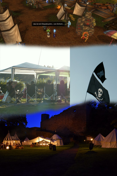 Und eines Tages dann wurde eines der Treffen mit Hilfe eines Mittelalterlichen Verleihers, viel Zeit und Engagement in einem phantastischem Setting organisiert. An einer Burgruine mit mittelalterlichen Leinenzelten und mehr. Und da stellte sich heraus, dass so manch einer solch Equipment schon besaß. Liverollenspieler waren sie und verkörperten auch darin andere Charaktere als im Onlinespiel. Dieses Treffen 2010 änderte alles. Die Burgruine und der davor liegende Zeltplatz sind noch heute Treffpunkt unseres jährlichen Gilden-/Vereinstreffens.